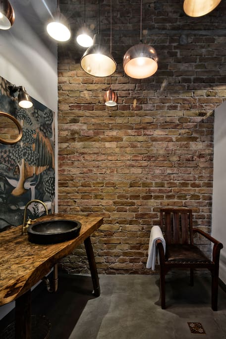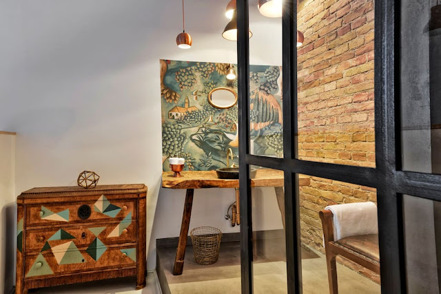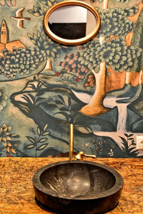 "A csodás Zoffany tapéta színeit kevertük ki, és úgy festettük rá a geometrikus formákat. Az Antik Szigettől van a disznóvágó asztal, amiből fürdőpultot alakítottunk ki velük, a gyönyörű dió étkezőasztal, amihez zárszelvényből lábakat hegeszttettünk, a román thonett székek, a kb. 100 éves 250 cm magas ajtópár, amiből tolóajtót készítettünk."