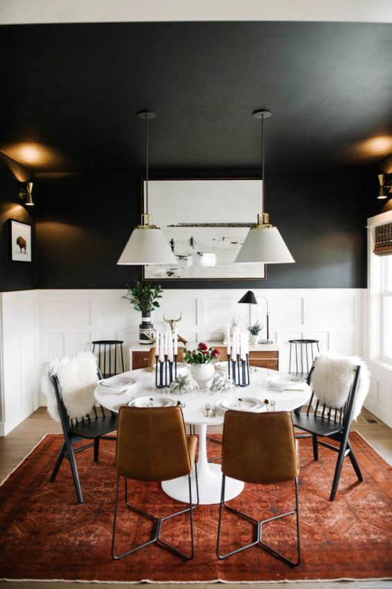 Érdekes megoldás, és nagyon mutatós: fehér falburkolat, fekete oldalfalak és mennyezet… Tetszik nekem, hogy nem tudni, hol ér véget a fal, és hol kezdődik a plafon: kis belmagasságú otthonokba kifejezetten előnyös lehet!