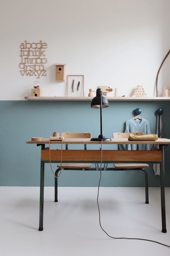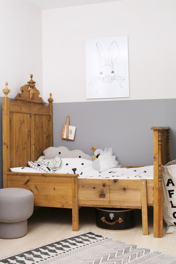 A mi gyerekszobánkban is éltem a falak optikai "félbevágásával" (itt). Elsősorban azért, mert nagyon trendi és tetszik nekem, de van gyakorlatias haszna is. Egy nagyobb belmagasságú szoba ilyen formán festése kicsit "összefogja" a teret. Barátságosabbá válik, és ember (pláne gyerek) léptékűbbé… Jó szívvel ajánlom.