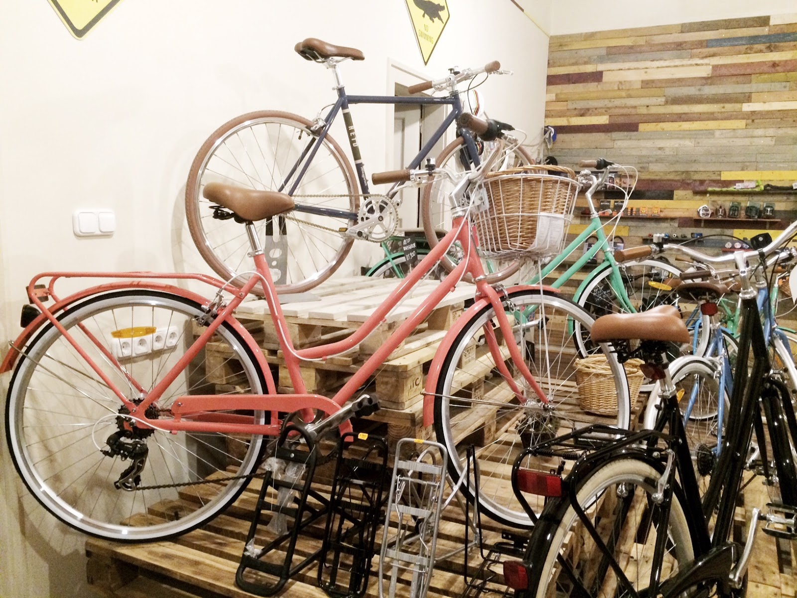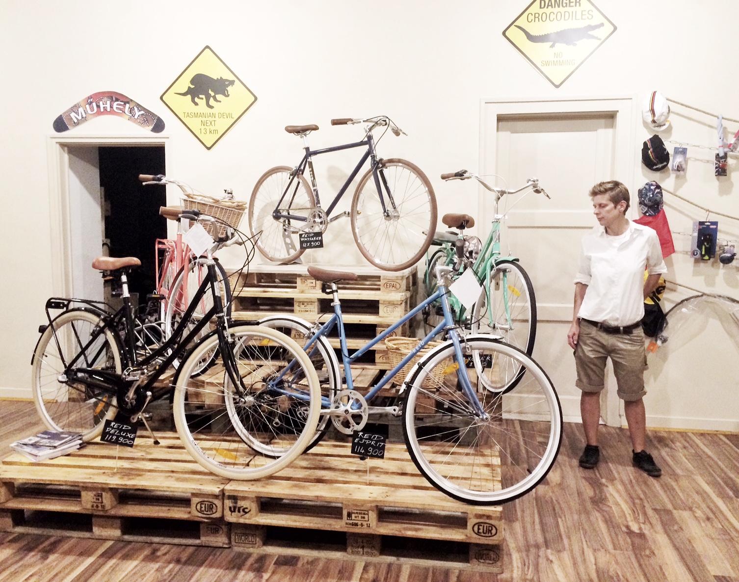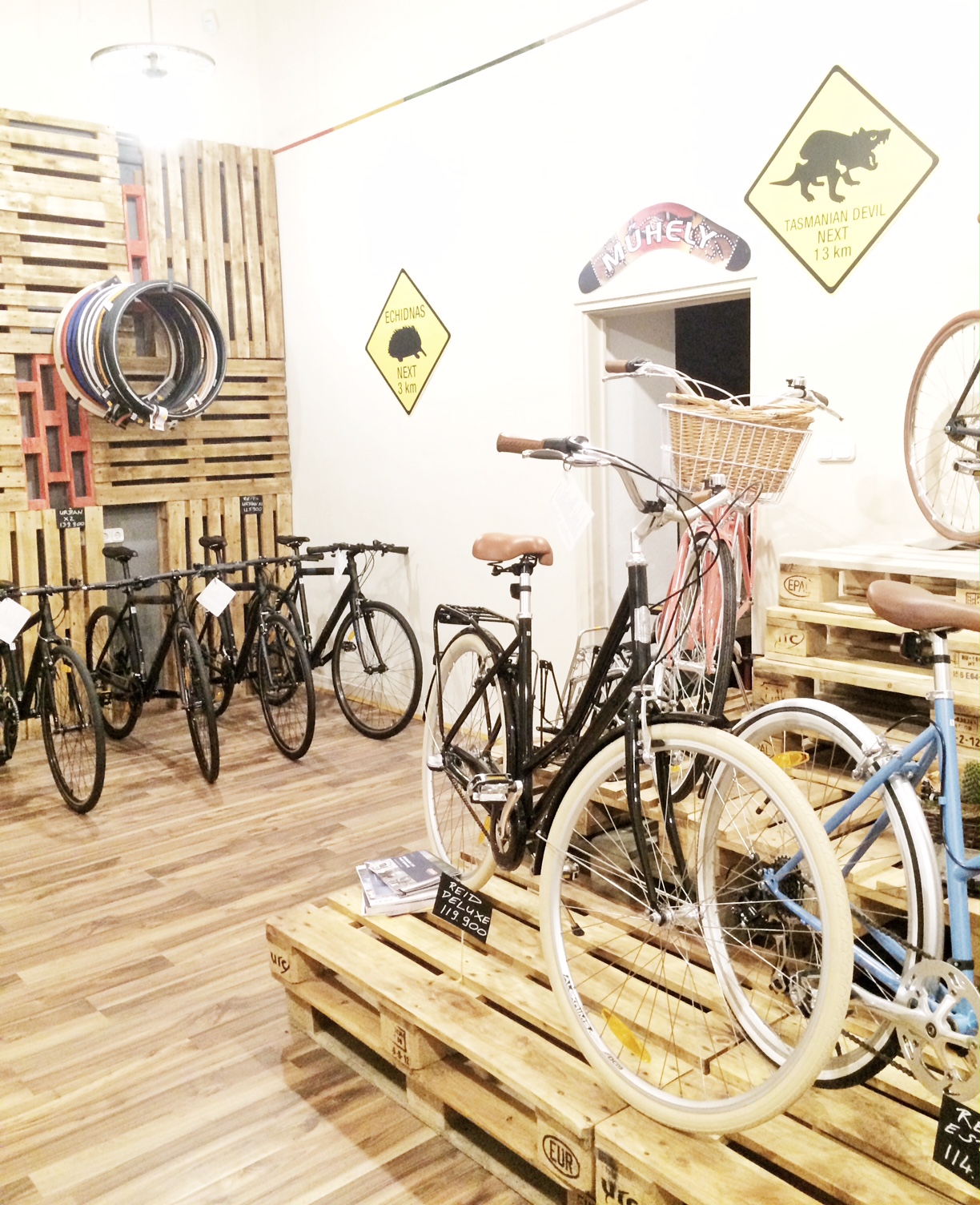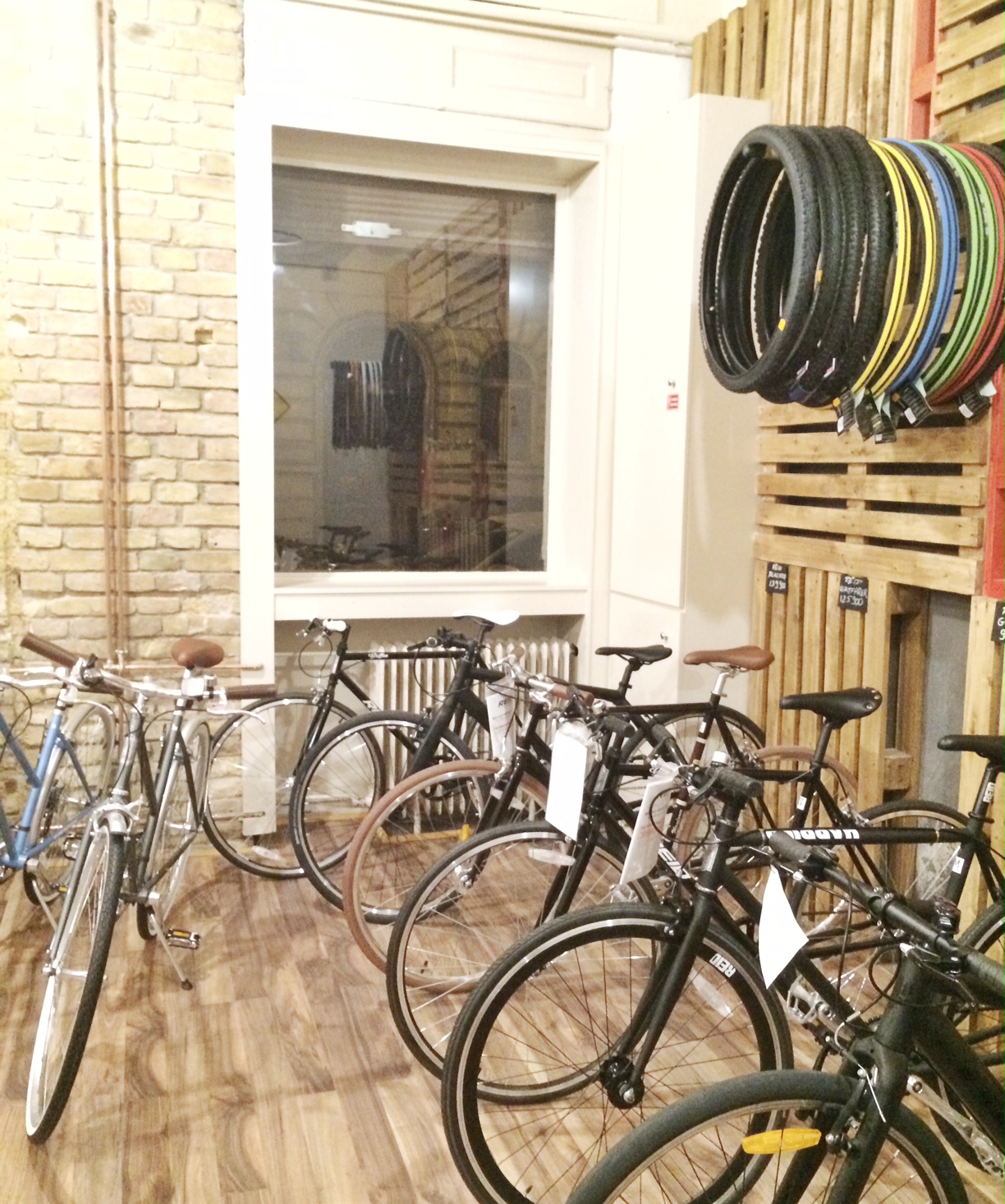 A historikus ház földszintjén található enterőr a létező legegyszerűbb kialakítást kapott, ami ötletes, költséghatékony, és nagyon ízléses körítést biztosít a sok szép kiállított biciklinek. A raklap piramis csúcsán pedig az egyik legszebb darab áll: iszonyú jól néz ki a kék váz a barna kiegészítőkkel és gumikkal. Igaz, hogy nem csaj bringa, de gondolkodom rajta… Nem tudom, mennyire jön át a képen, de arany színű a lánca! :)