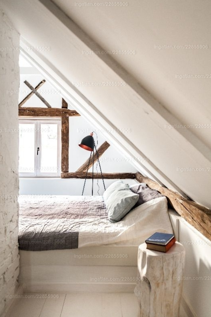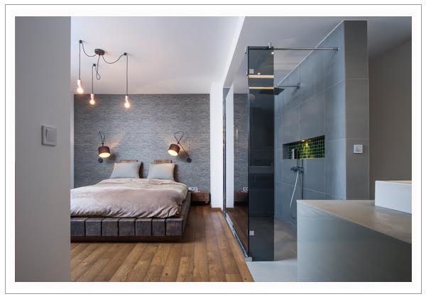 Egy egyedülálló férfinak nagyon vagány megoldás a fürdővel összenyitott hálószoba. Az ágyat megint csak egyedi tervek alapján készítettették. A falon lévő izgalmas éjjelilámpákat a Vészi Lámpa szállította le (ITT).