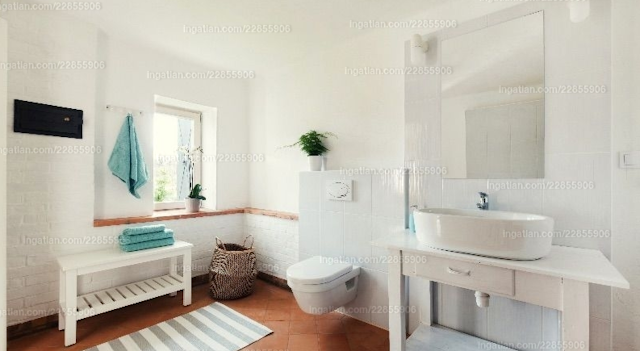 A házigazda személyes kedvence a fürdő. Nem nagy a helyiség, mégis két mosdó szolgálja az itt élőket, és bekerült egy kis akrilkád is, igaz, ezt vazelinnal kellett betuszkolni a tervezett helyére, de végül sikerült! A mosdók helyét egy megmentett és felújított retro szekrényből alakították ki: a megoldás két éve a Spekrtum Home TV előtte/utána pályázatán díjat is nyert