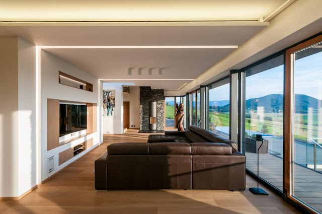 Őrült szerencse, ha lehetőség adódik hatalmas ablakfelületekkel, teraszajtókkal kapcsolódni valamilyen privát külső tér irányába. Nyáron konkrétan egy térként működhet a belső tér és a hozzá kapcsolódó terasz, de nem szabad lebecsülni az óriás ablakfelületek jelentőségét a téli időszakban sem. Amellett, hogy kimaxolhatjuk velük a házba jutó, ilyentájt aranyat érő fény mennyiségét, részünk lehet abban a különös és izgalmas élményben, hogy a téli táj szerves részévé válik a bent zajló mindennapoknak.