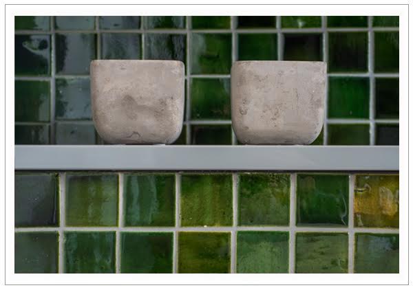 A kőhatású szürke lapokat a Rokfortból választották, és innen rendelték meg a zöld Pataki tiles mázas kerámiát is.