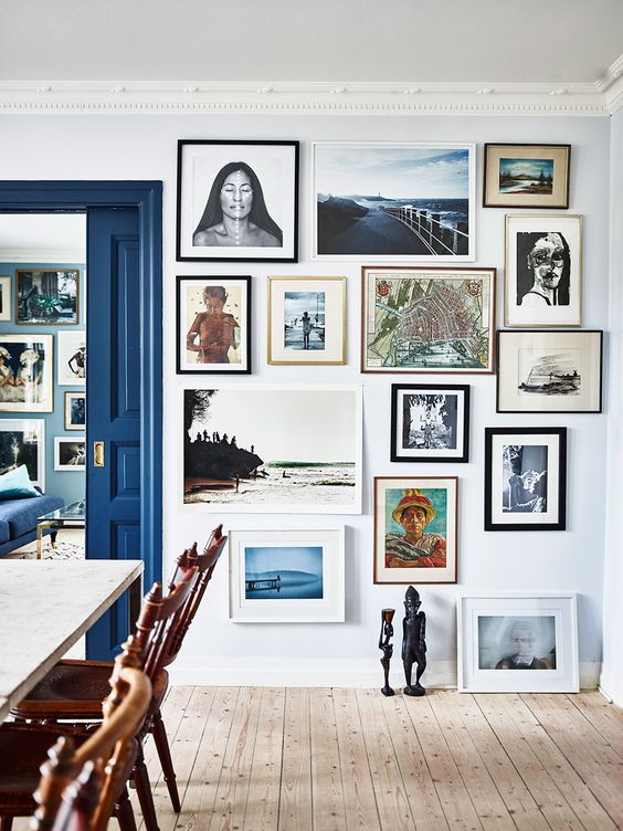 Én a legjobban persze ezeket a "vegyesfelvágottakat" szeretem. Amikor fotók, printek, poszterek, festmények és egyéb különlegeségek együtt szerepelnek a falon, jellemzően változatos keretben...