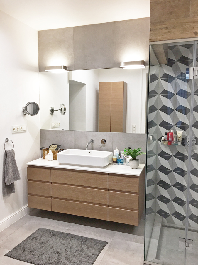 A zuhanyzó mellett alakítottuk ki a mosdót. A mosdószekrényt egyedi tervek szerint gyártattuk le, a pácolást a fahatású burkolathoz igazítottuk. A pult technikai kőből készült.