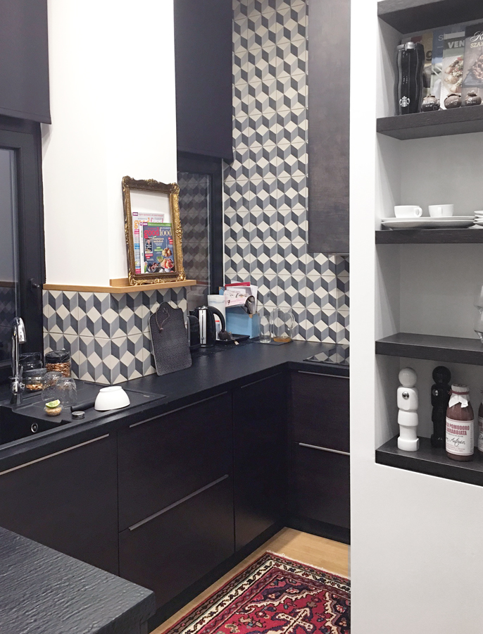 Az étkező másik oldalából lehet bejutni a falatnyi konyhába. A méret adottság volt, ám igyekeztünk a legtöbbet kihozni a kicsi, és furcsa formájú helyiségből. Kinga azt mondja, nagyon szeret itt főzni! :)