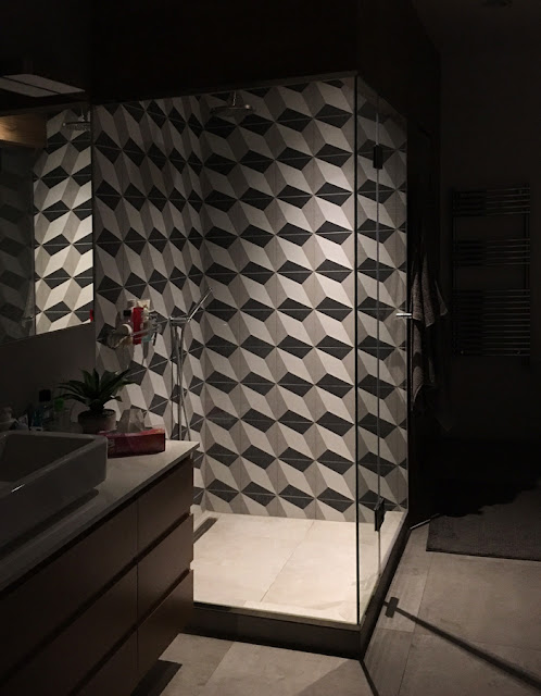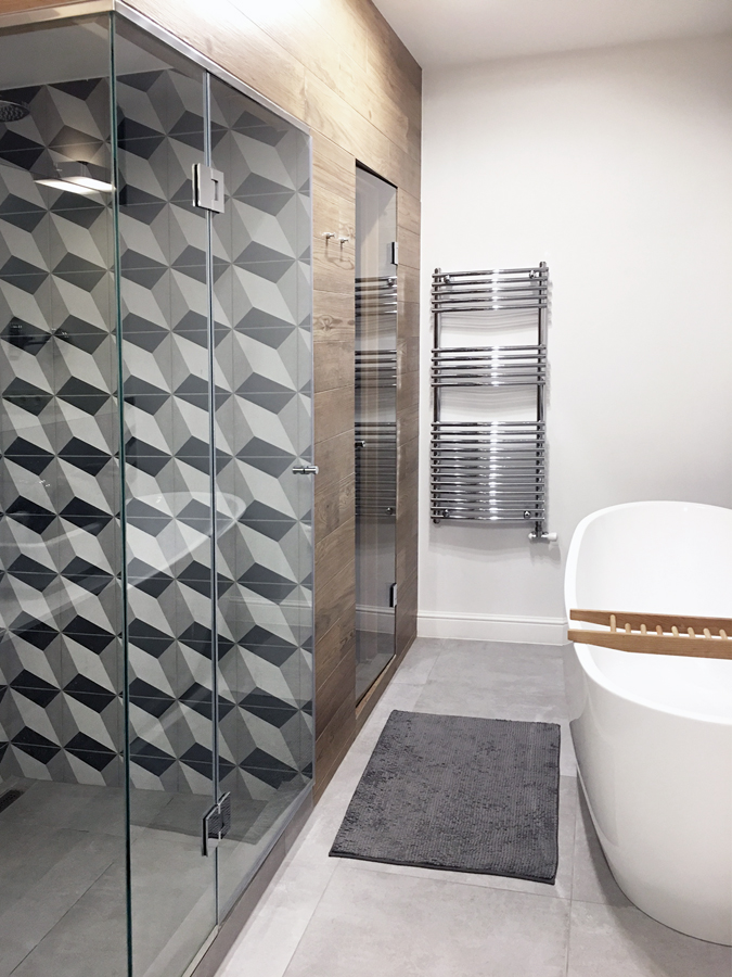 A helyiség nem kicsi, de sok funkciónak kellett helyet találni: a kád és zuhany mellé még egy infra szaunát is be kellett álmodni. A zuhanyzó és az infrakabin egymás mellett kaptak helyt, az így keletkezett "dobozt" kívülről fahatású kővel burkoltattam.