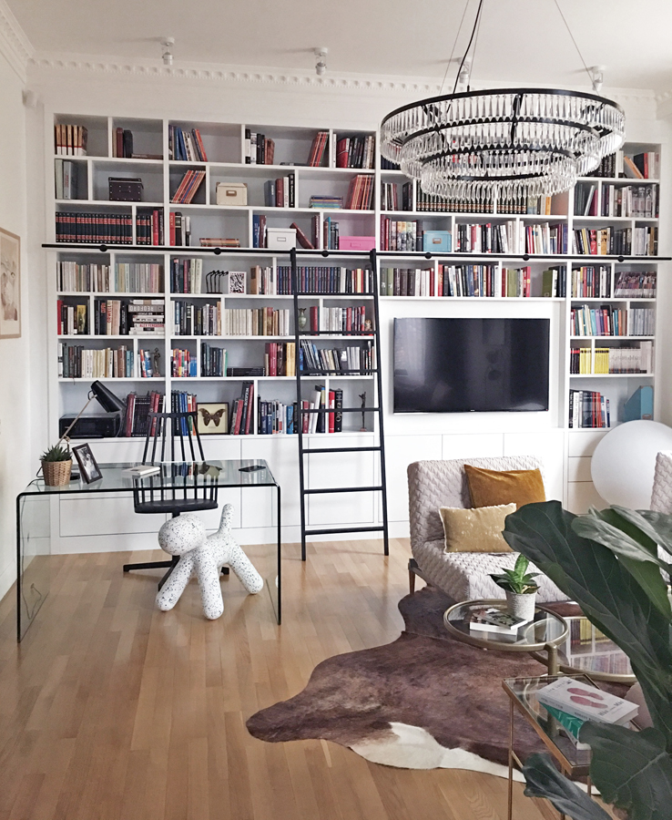 Ezt itt péltául a nappali: a beépített, létrás könyvespolccal, az álatalam tervezett egyedi csillárral, és Kinga szépséges kép-falával.