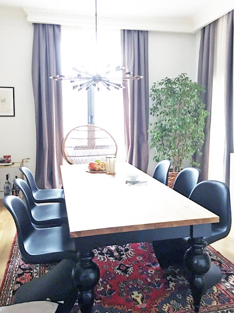 A nagy asztalt egyedileg gyártattuk le a terveim alapján. A "csicsás" fazonhoz végtelenül egyszerű Panton székeket választottunk. Felette az indiából hozatott sputnyik csillár.