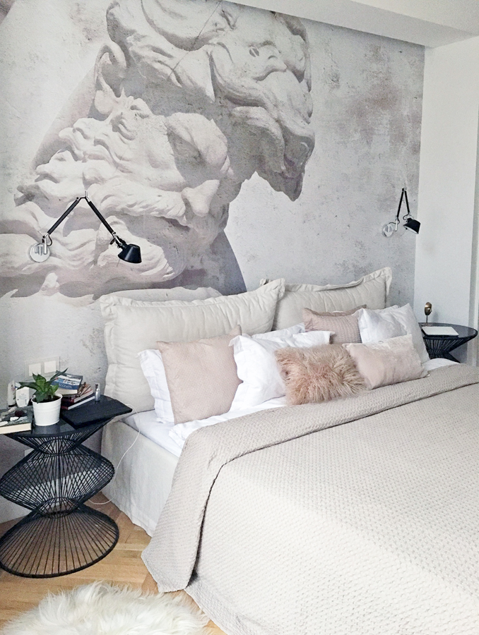 Az ágy feletti tapétát egyedileg készítettük, ezt esete melegfényű led világítja meg.