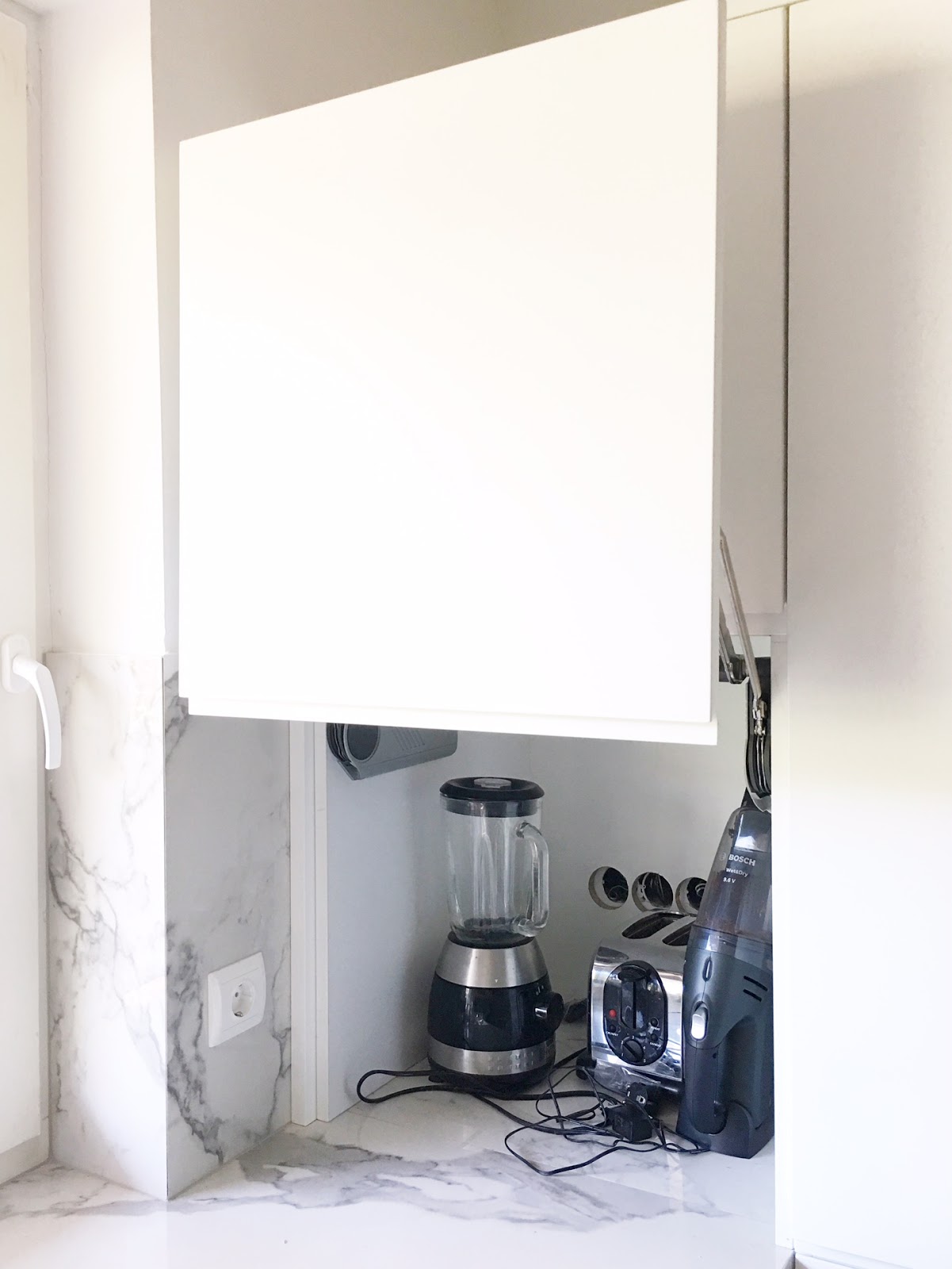 A konyhapultot befuttattam a falig, és itt tartom az olyan kütyüket, amiket nem akarok látni a hétköznapokban, pedig napi szinten használok. Olyan ajtót terveztem rá, amelyik felfele nyílik, de úgy, hogy nyitott állapotban se zavarjon használat közben. Pirítós sütő, turmix gép (ez a fogyókúrás üzemmódomban napi szinten használt cucc), morzsa porszívó például. A gépek a szekrény hátában kialakított konnektorba vannak bedugva, csak ki kell húzni őket a pulton, és már mehet is a munka. Ha előkerül a villanyszerelő… Addig abba az egy szem dugaljba rakom őket a szekrény mellett… :)
