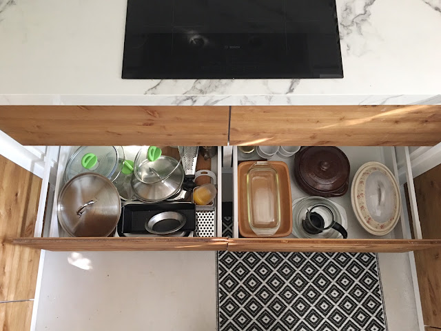 Az alsó fiókok egyikében a lábosok tetejét, meg egy-két kütyüt (pl nokedliszaggató) tartjuk, a másikba jénaik és cserépedények kerültek. Meg valamiért most ott lakik a teáskanna, de az nem én voltam… :)