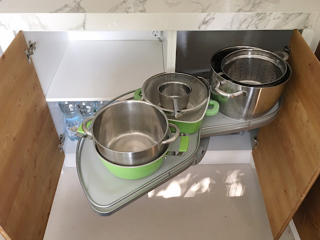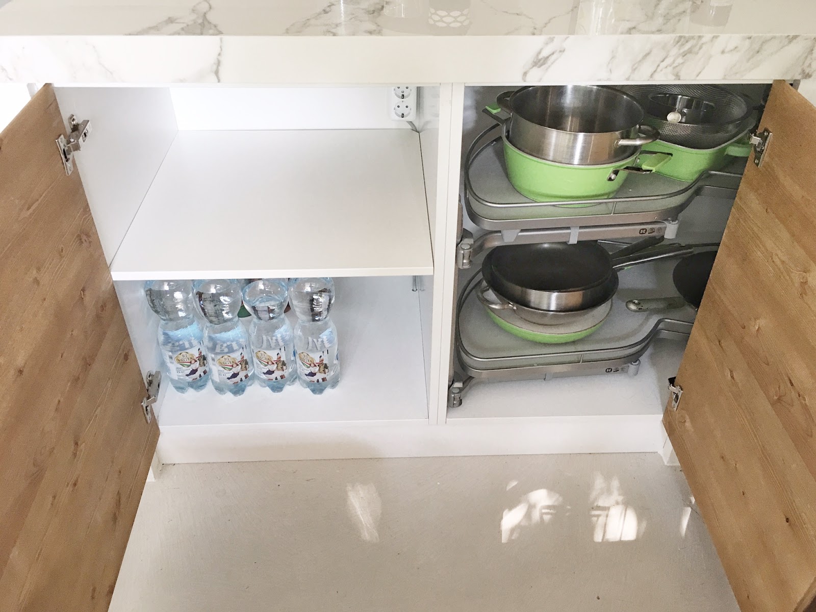 A sarok elemben én a kiforgathatóst preferálom. Volt már dolgom úgynevezett "magic cornerrel" is, de az nekem körülményesebb. Igaz, azt mondják, az még jobban kihasználja a helyet, de nekem ez az egy mozdulattal kifordítható cucc sokkal egyszerűbb, és - amint látjátok - helyproblémánk amúgy sincs.