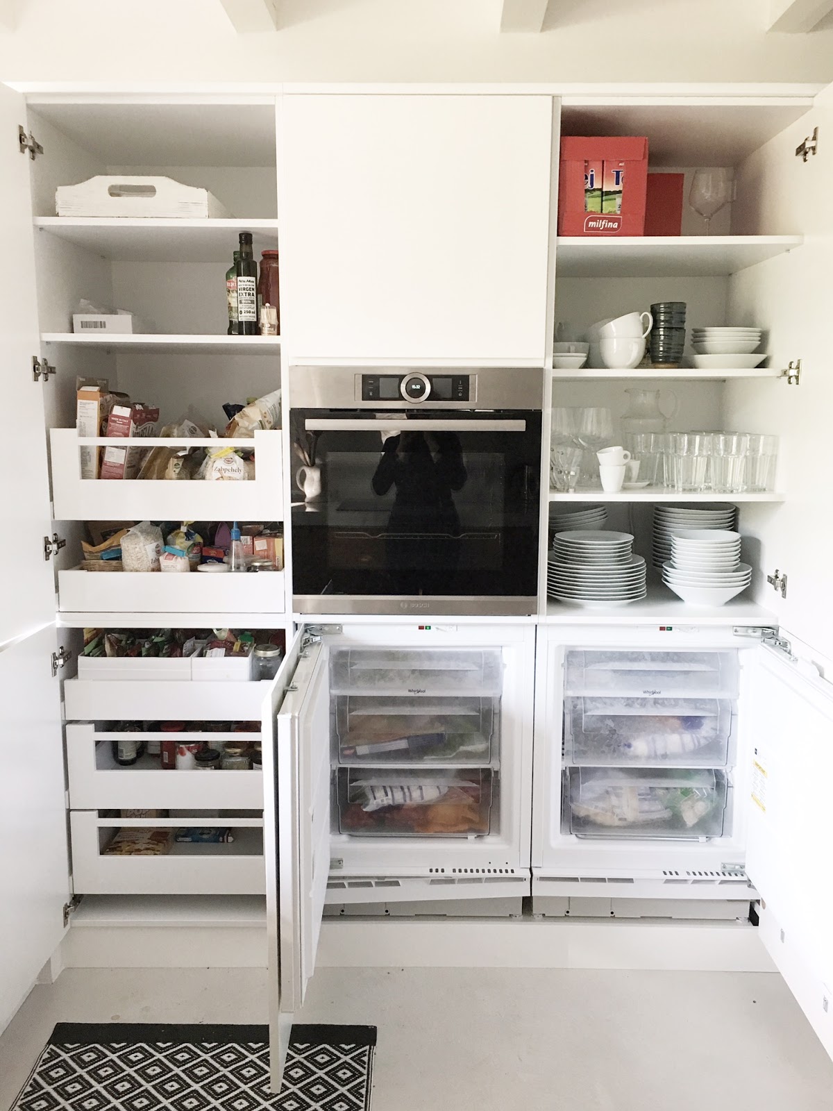 Az eredeti tervemen a sütő alá is tárolás került, és egy, magasabb mélyhűtő volt a hűtő mellett (a hűtő most nincs a képen), de nem találtam abból a méretből jót, ezért egy helyett kettő kisebbet helyeztünk el. Erre azért volt szükség - mármint a külön mélyhűtőre - mert megszoktuk a nagy méretű hűtőt az előző házban, ahol szabadon álló side-by-side darabunk volt, márpedig egy egyszerű kombinált hűtő nem hozza azt a méretet, nem beszélve arról, hogy a beépített hűtők jelentősen kisebbek a szabadon álló társaiknál.