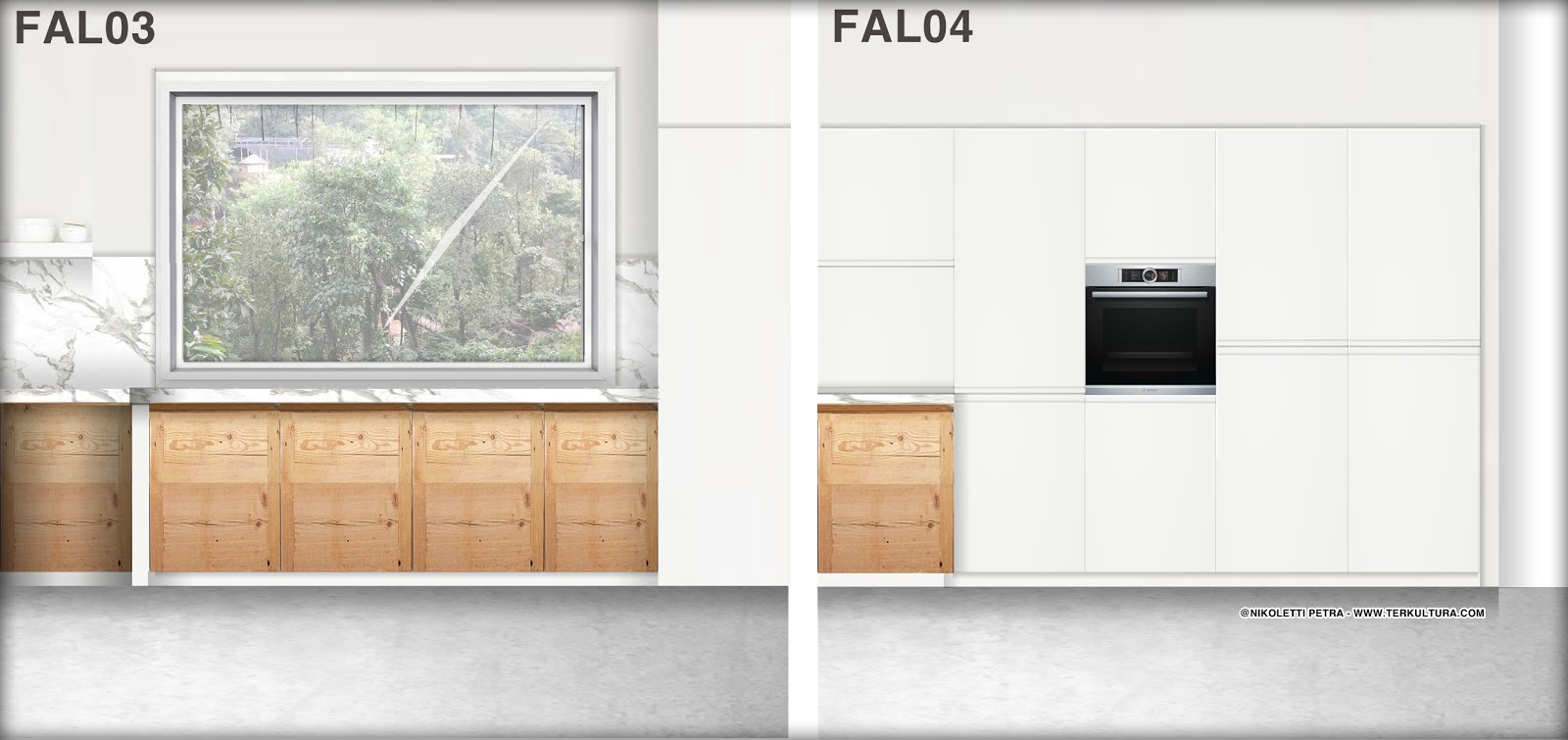 Haladjunk tovább, a beépíett konyhafal felé. Ezt eredetileg be akartam süllyeszteni gipszkartonba (magyarán körbe gipszkartonozni, miután elkészült), de arra jutottam, hogy sokkal szebb a helyiség szimmetriája, ha nem csinálom, így megkértem az asztalost, hogy inkább készítsen egy 2 cm vastag keretet körbe.