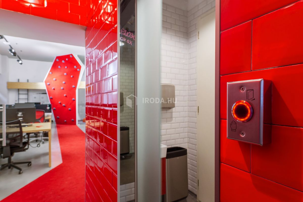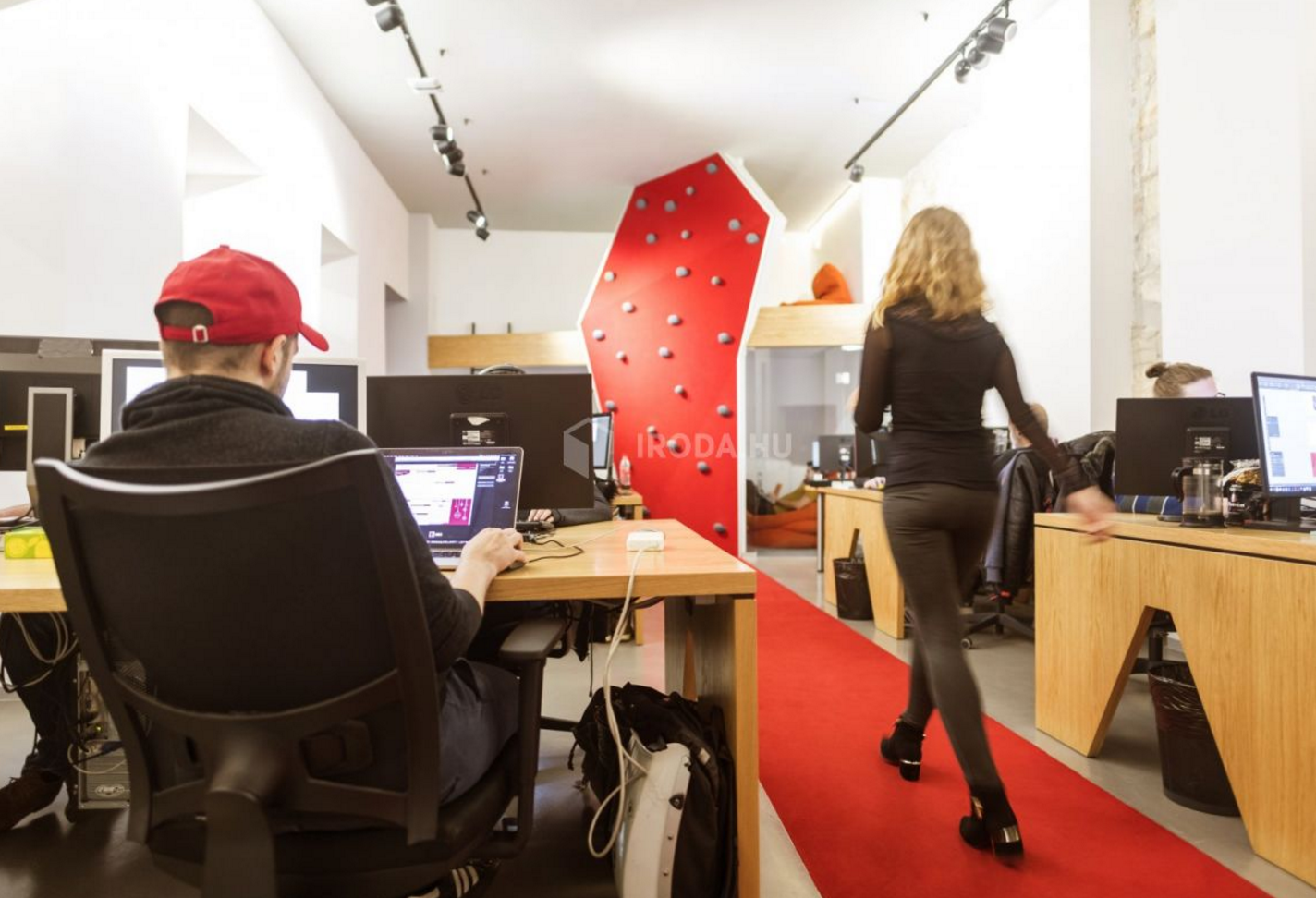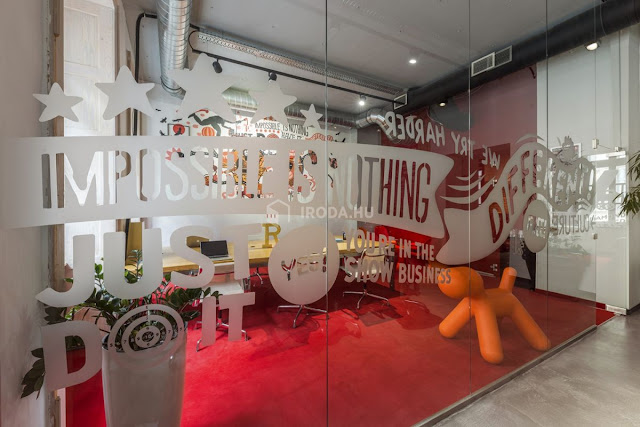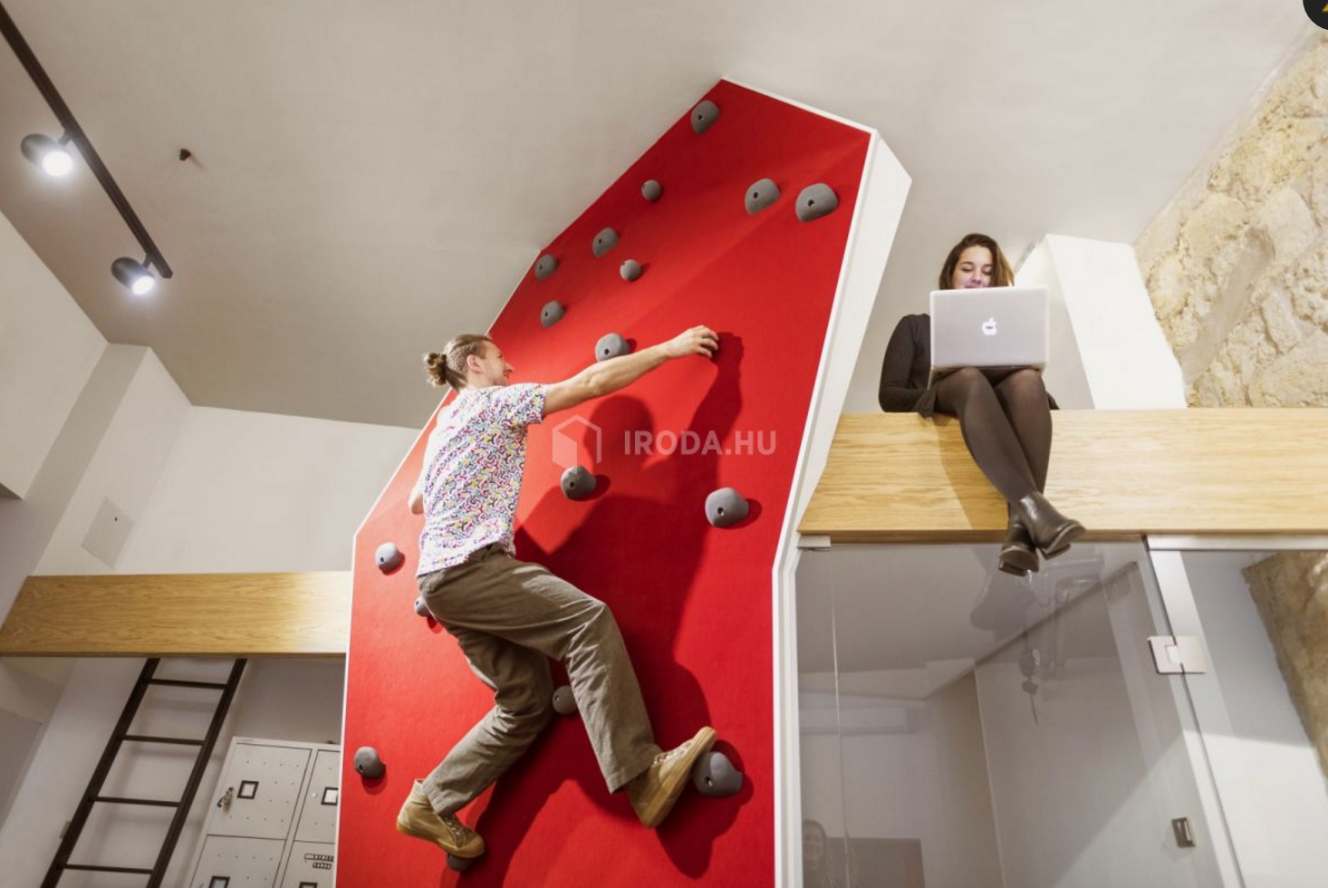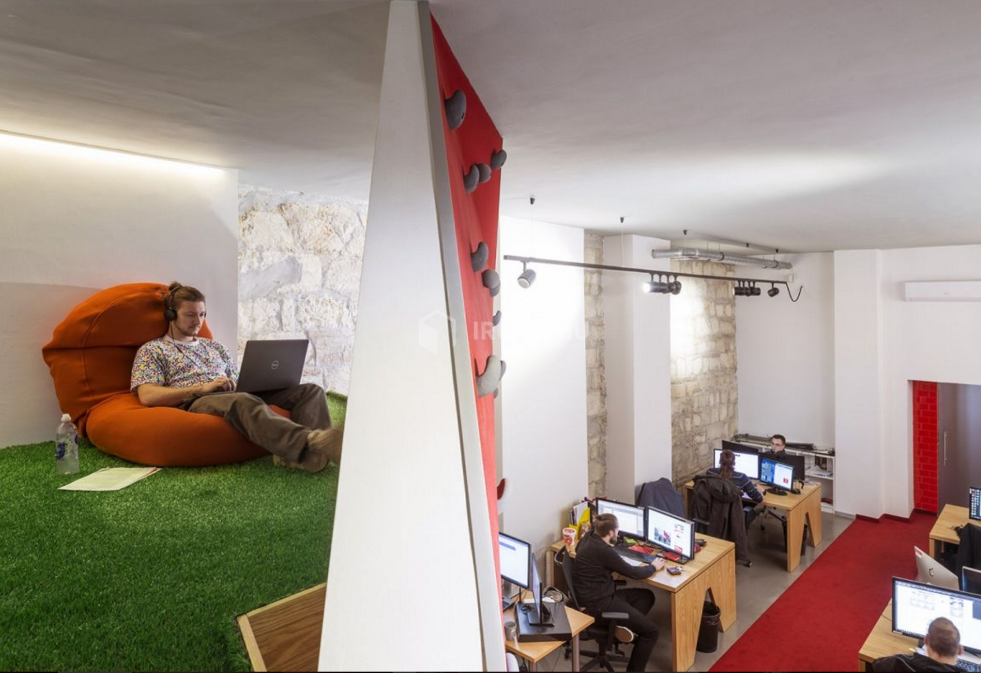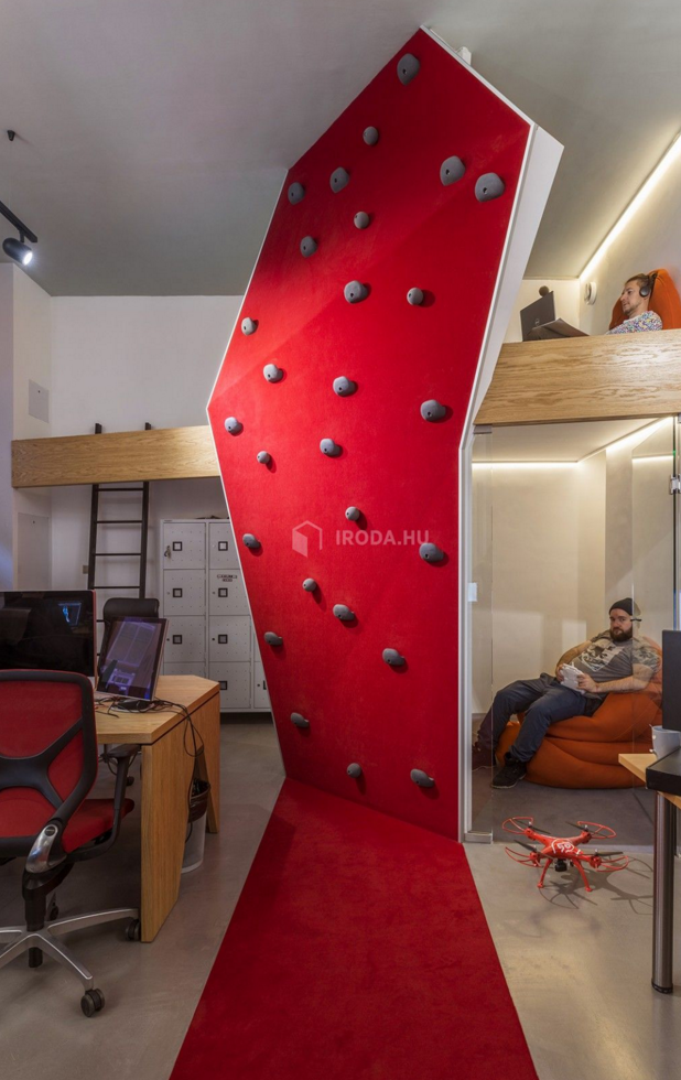 Az egyszerűenk tűnő kiidulást nehezítette a nem túl tágas rendelkezésre álló tér, és bónuszként járt a legszigorúbb megkötésekkel járó műemléképület-státusz... :) Kiindulási alapul az agy oxigénellátását felturbózó testmozgásos kreatív szüneteket vettük: így a rengeteg ülőmunkával járó irodai közeget az extrémsportok világával vegyítettük. Első lépésként a 2-4 fős munkaállomások ergonomikus kialakítása történt meg egyedi gyártású asztalokkal, körülöttük Sitland és Wilkhahn székekkel. A statikus munka ellenpontjaként az asztalok között futó piros szőnyeges közlekedő részt - amely szervese csatlakozik a már akkor meglévő, szintén szőnyegezett lépcsőházi és bejárati terekhez - egy mászófallal zártuk le. A megtört, szabálytalan geometriájú felület valódi, használható fogásokkal készült falépítő szakember tervei alapján. Ez a sport minden izomcsoportot megmozgat, új értelmet ad az irodai nyújtózkodásnak. A sporteszköznek kommunikációs üzenete is van: az irodában a szellemi munka mellett fizikai felfrissülésre is van mód. Megmászva a falat egy műfűvel borított galériarészbe jut az ember, ahol kötetlen környezetben tud pihenni, ötletelni, laptoppal dolgozni. A nyitott terek mellett szükségesnek tartották egy zárt helyiség kialakítását is. Így kapott helyet a galéria alatt az üvegfalakkal határolt „kreatív kuckó", ahol bátran megnézhetnek egy filmet a tv-n, de a közeg egy családias meeting-roomnak is megfelel.