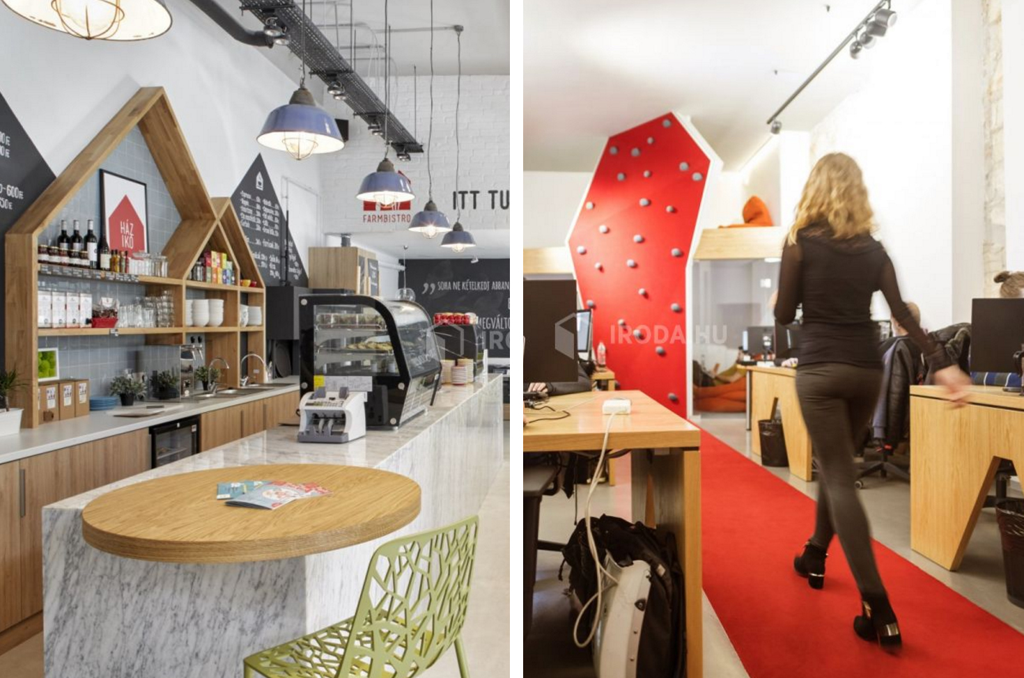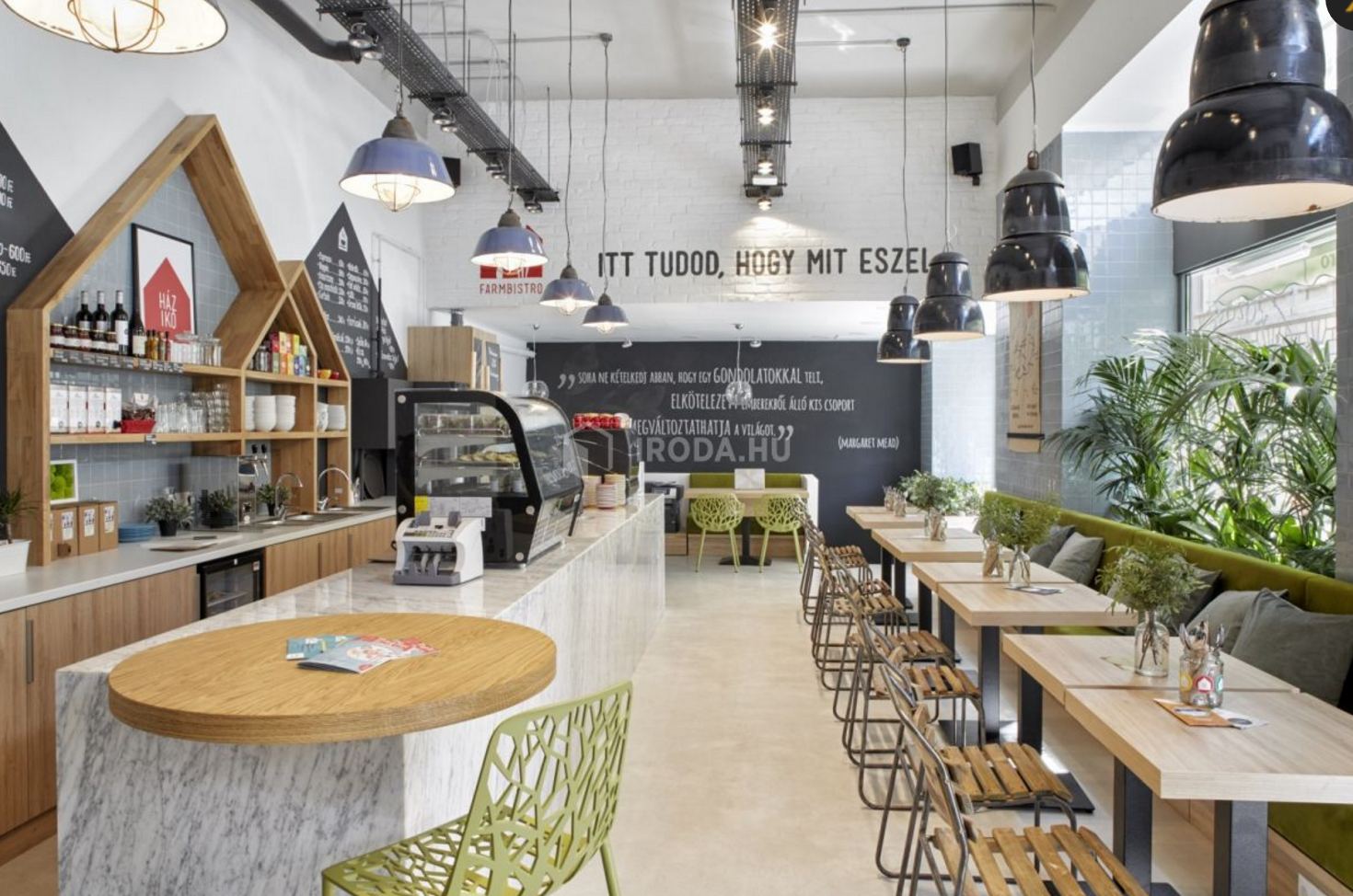 A tervezés során fontos szemont volt számunkra, hogy markánsan megjelenjenek a már kialakult stílusjegyek - a márványpult, a szürkés-kék színű csempe, a sok növény, a zöld kárpit - mindezek mellett prioritásként kezeltük, hogy a HÁZIKÓ csapata is hitelesen megjelenjen már a design részeként is. Így alakítottuk a pult mögött található meglévő beugrót házikó alakú polcrendszerré, amely finom utalás (hahaha...) a Farmbisztrót üzemeltető cég kilétére.