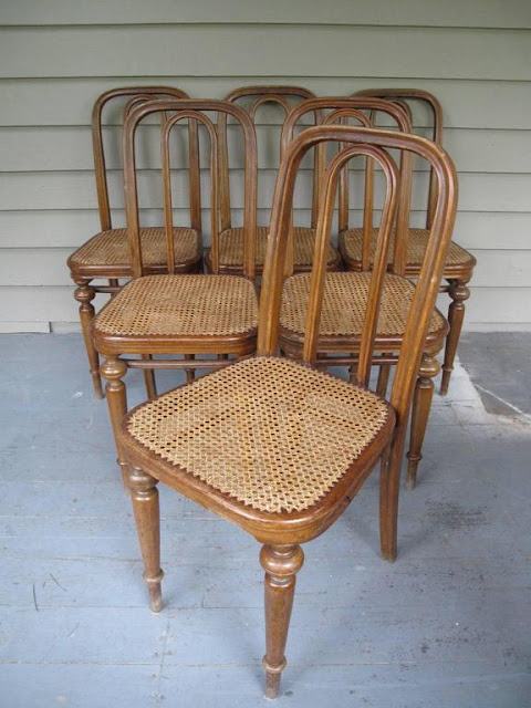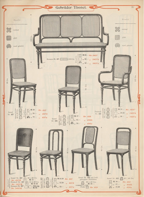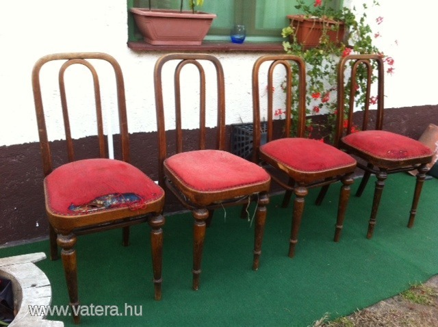 Tegnap este leütöttem négy nagyon különleges széket a Vaterán. Rákerestem a különböző szakértő portálokon, és megtaláltam, hogy ez a Thonet Nr 41-es, vagy egy másik katalógusban Nr 441-es szék. Ami érdekes, hogy a támla fa részének kialakítása nem befele olyan íves, mint az alábbi székeken, de megnéztem az 1906-os katalógusban (22. oldal) és valóban - külön kérésre - rendelhető volt "glatt", azaz sima profillal is. Kicsit aggódtam, hogy talán a nádazását szétszedték és rákárpitoztak (bár a kárpitozás megoldása elég "original"), de aztán megtaláltam a neten ugyanebből a szériából az alábbi, fa ülőfelületeset, így már biztos vagyok benne, hogy lehetett kárpitozva is rendelni. Jobban tetszene nádazott, vagy fa változatban, de így legalább kényelmesebb... :)