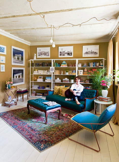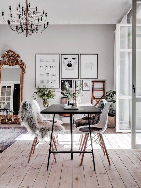 Hoztam egy másik képet, ami nagyon jól megmutatja, hogy miről beszélek, amikor az egyedi tárgyak erejét méltatom. Ez is tele van közhelyekkel, replikákkal, mégis sokkal izgalmasabb... Itt is van Ikea asztal (szerintem csak a láb az, az asztallap valami más...), kamu Eames szék, kamu Gino Sarfatti csillár... Vagy eredeti? Egy műértő akár összespórolja, ha nincs feleslegesen kiadandó pénze, szóval a fene se tudja, de nem is számít... Csak azt akarom mutanti, hogy ugyanazok a közhelyes dolgok mennyire másképpen jönnek ki, ha megfelelő körítést adunk nekik. Egy eredeti barokk tükör, egy fa létra, a háttérben megbúvó nádazott szék, a - szintén nem hű, de egyedi, viszont - szép, kopott perzsa, és ami még nagyon lényeges: az eredeti fa hajópadló (ez egy olcsó verzió, fenyő, és nem a drága tölgy svédpadló!) együtt életet lehelnek a térbe. Pedig a képek itt is elég kommerszek, de van létjogosultságuk: letisztultságukkal ellenpontozzák a barokk tükröt. Valahogy az az érzésem, hogy a képek teremtenek hidat a cirádás aranykeretes tükör és a csillár között.