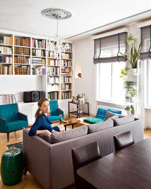 Az alábbi képen egy panelban is szuperül mutató intellektuális polgári eneteriőr látható. Elég könnyed recept... Először is egy egyszerű Ikea Stockholm bőrkanapét látunk (500.000 Ft, de tényleg klasszul néz ki), amelyet egy natúr Kilimmel tettek egyedivé (például itt - 150.000 Ft), a svéd designer csapat Pholc Tage 50 lámpáját nem találom a saját oldalukon, de itt van egy 110.000 Ft körüli áron, nem tudom, ennek a zöldje ugyanolyan szép-e, vagy ez valami festett kamu... Ahhoz képest, hogy - építészeti nézőpontból - az egyik legnagyobb magyarunk, Breuer Marcel tervezte a Wassily fotelt, fájóan keveset látni belőle itthon. Most eladó kettő a GaleriaSavarian (itt). Nyomtass képeket, rakj be növényt, és szevasz, kész a tökéletes (nem csak...) panel enteriőr. :)))