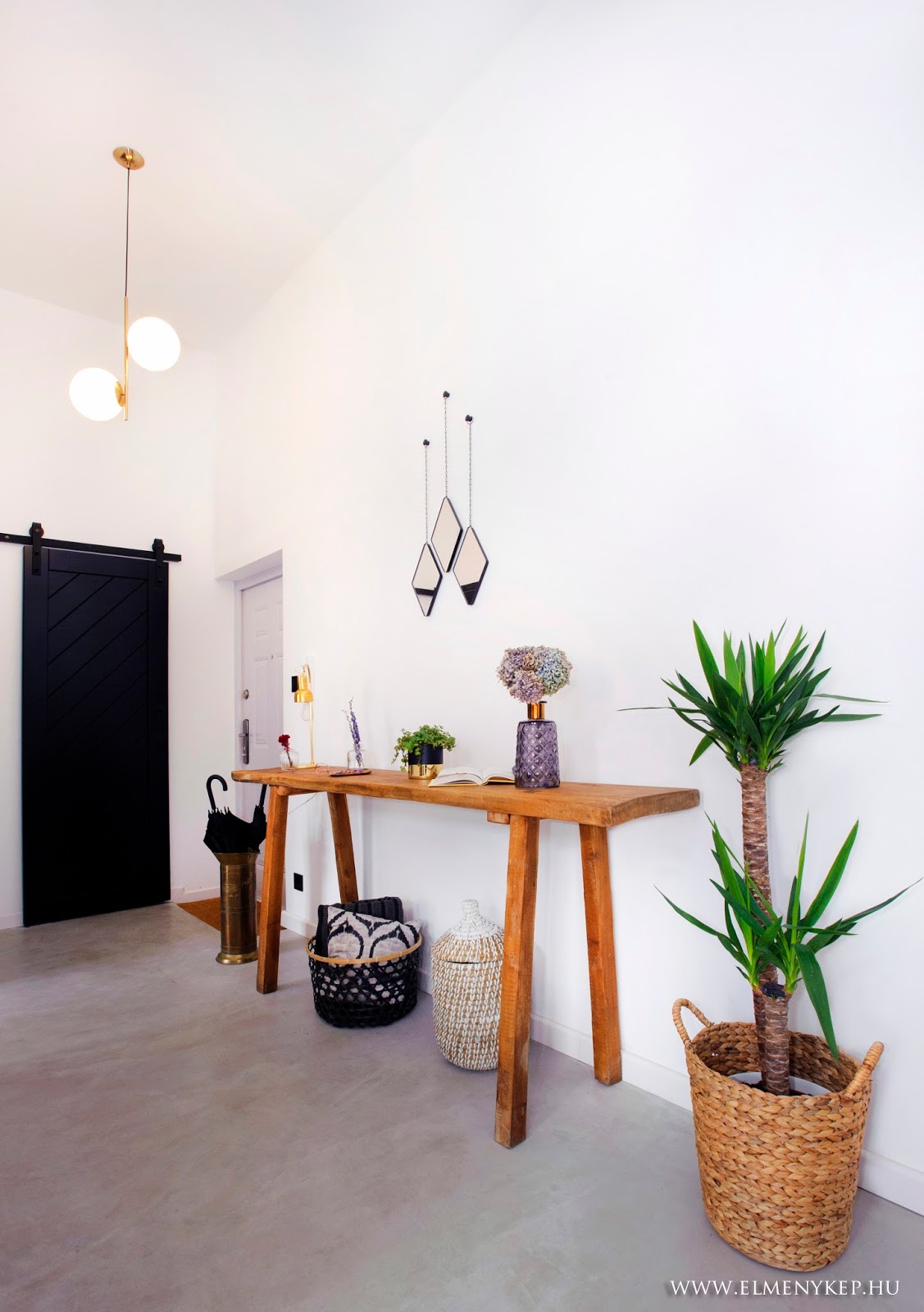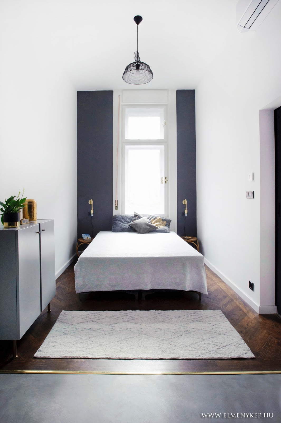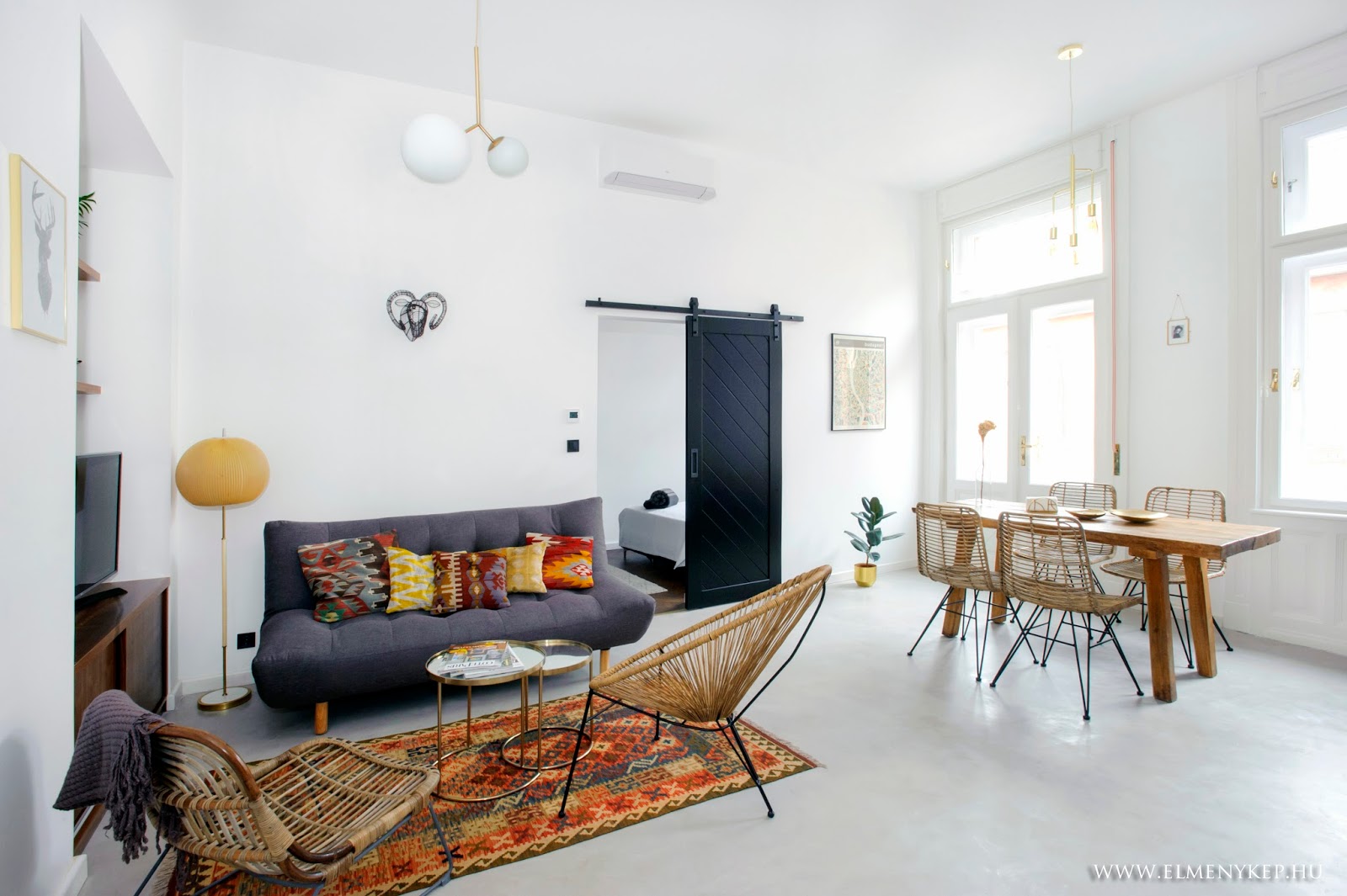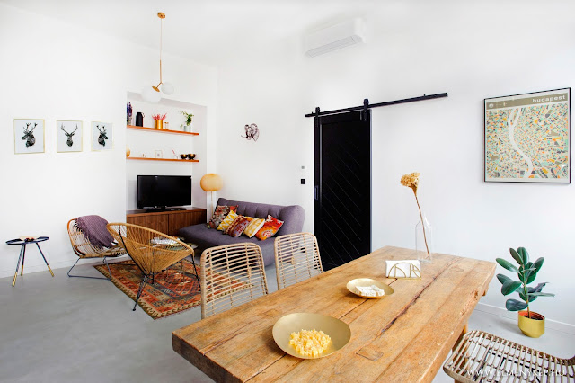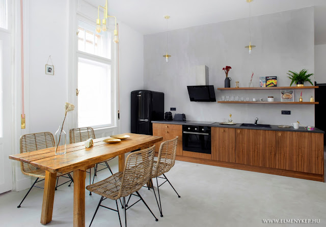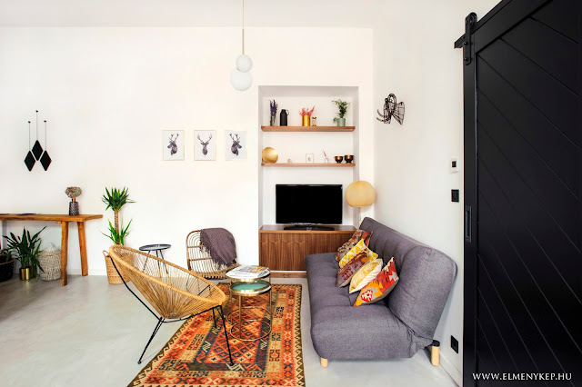 Ez a lakás csodásan néz ki, tökéletes ízléssel megkomponált. Minden menőség megvan benne (felső konyhapolcok, kosarak, beton, yucca, perzsaszőnyeg, függönytelenség, minimál, kicsi midcentury, kicsi ipari, fekete, szürke, arany).