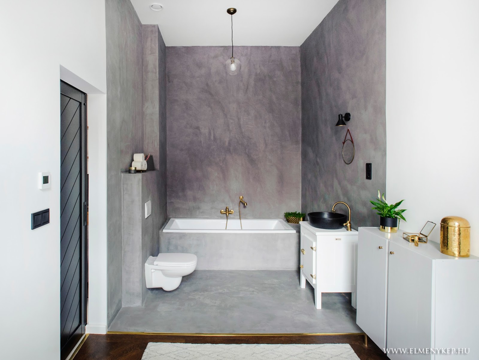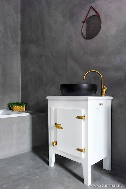 A kedvenc darabom a lakásban a mosdószekrény, amit Jófogáson vettem 8 ezer forintért. állapotban volt, épp a nővérem és apukám is ott voltak velem, amikor átvettem, csodálkozva nézték, hogy én azért a darabért képes voltam pénzt adni :) Most pedig alig tudják elhinni, hogy ugyanazt a szekrényt látják a fürdőszobában. A fekete kő mosdótálat Németországból rendeltem a Tikamoon oldaláról. Az alap koncepcióm az volt, hogy az arany és réz lámpákat és kiegészítőket fogom keverni a betonnal és rusztikus bútorokkal.