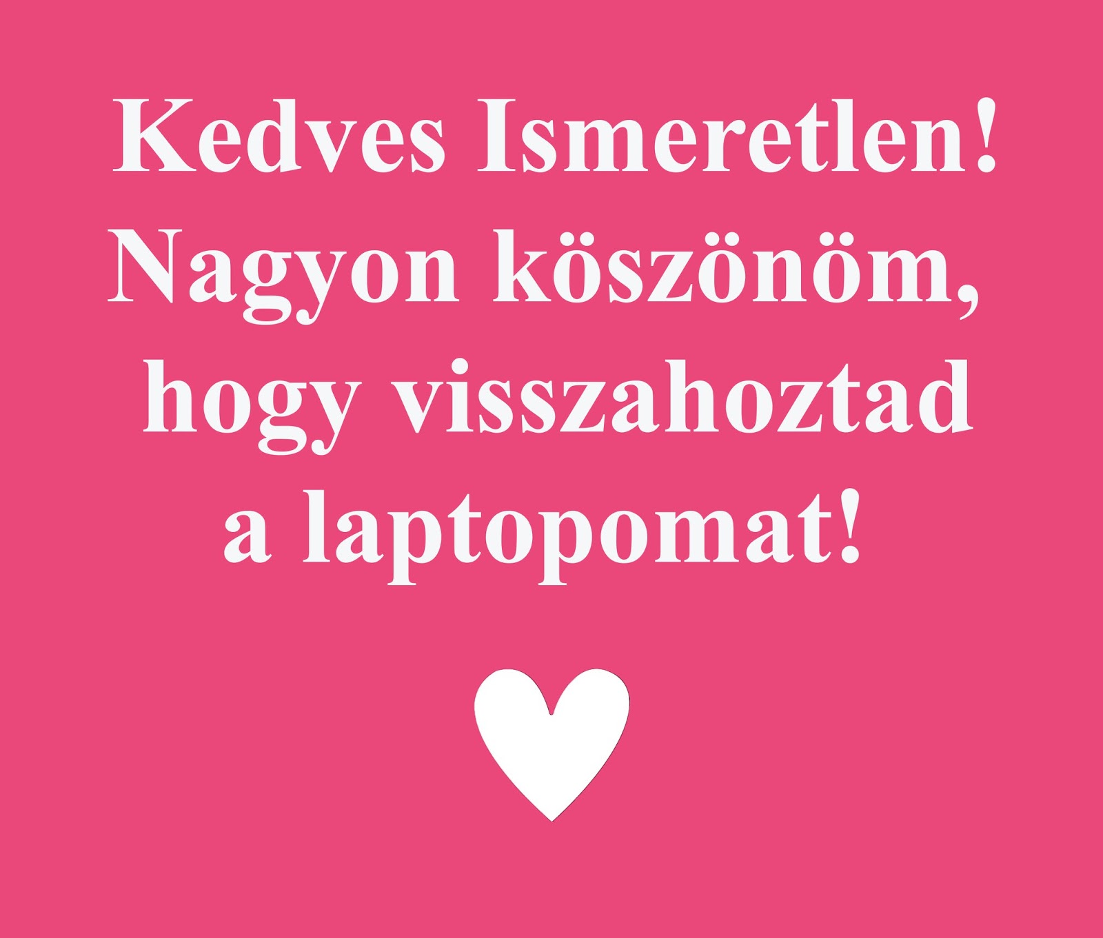 Hogy iszonyúan ki vagyunk éhezve a jó szóra... Az emberek jelentős részében olyan mértékű frusztráció halmozódott fel , hogy mások legkisebb hibájára is ugranak, mint eb a koncra, így vezetve le a feszültséget. A 3400 megosztás bizonyítja, hogy mennyire elegünk van már az örökös gyűlölködésből, és mennyire vágyunk az emberi szóra. Mindenkinek azt javaslom, mielőtt lebuziköcsögözi a másikat, mert mondjuk elvitte az őrizetlenül hagyott laptopját, kicsit nézzen már magába, nem fordult-e már elő vele is olyan, hogy "talált tárgyként" kezelt valamit... Ne adj isten ne lopott volna el valamikor valamit, mint például én.