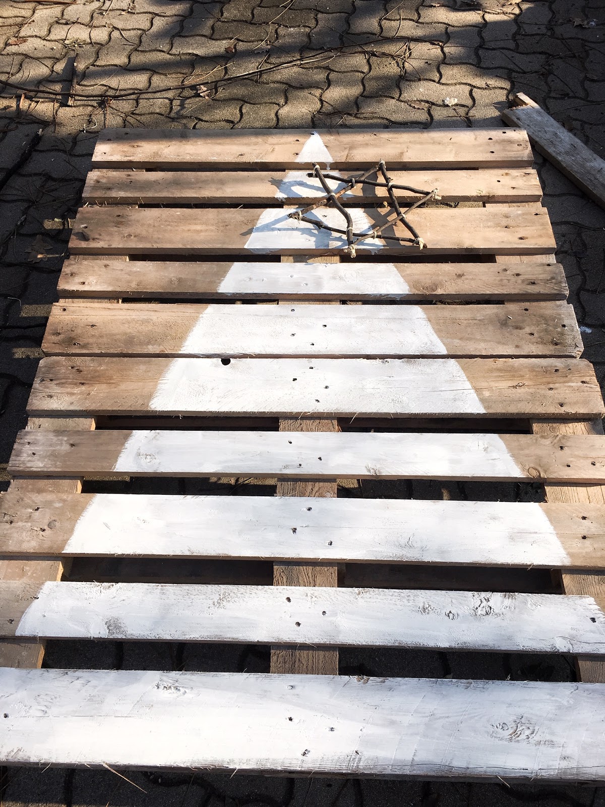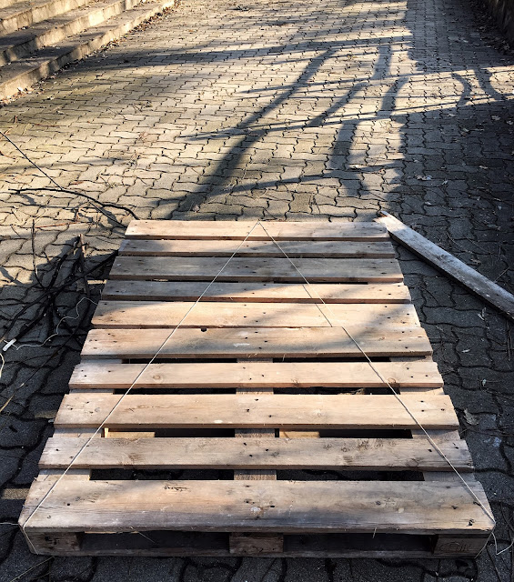 Letettem a raklapokat egymás mellé a földre, és kijelöltem a felfesteni kívánt minta határait. Először maszkoló (tesa) szalaggal gondoltam megoldani, de az összes itthon lévő tekercs tönkrement (össze-vissza szakadt, ahogy le akartam hámozni), így jó pár "bé" betűs szó dünnyögése után kreatívan madzaggal jelöltem ki a háromszög formát.