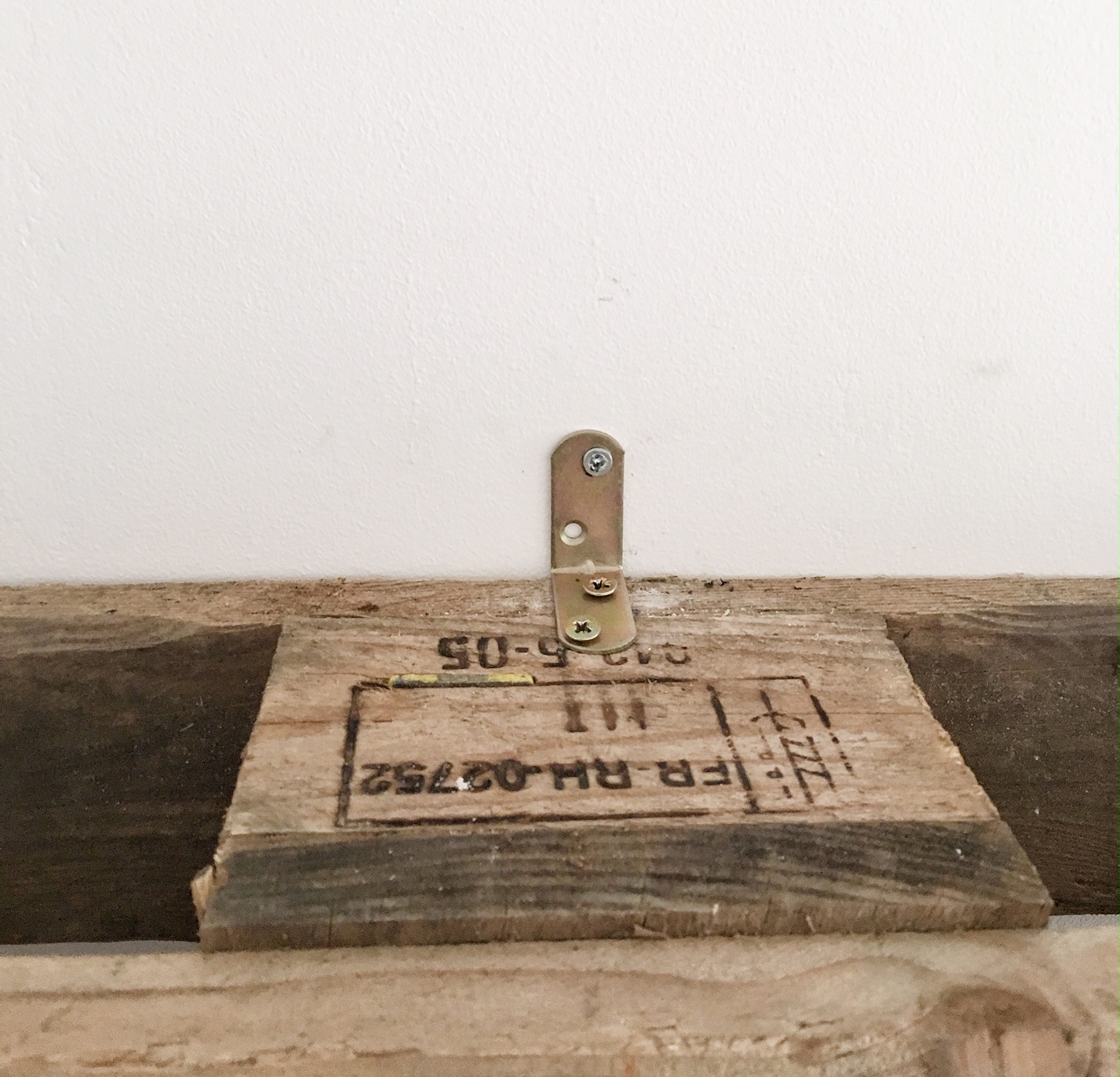 Amikor mindennel elkészültem, bevittem a két festett raklapot a nappaliba, festet felülettel a földre raktam őket egymás mellé (ott, ahova szántam őket, hogy ne kelljen cipelnem, mert együtt már nem egy emberes meló lenne), és két deszka darabbal összerögzítettem őket. A képen - még szabadon - látható deszka darabokat hátul-belül felcsavaroztam.