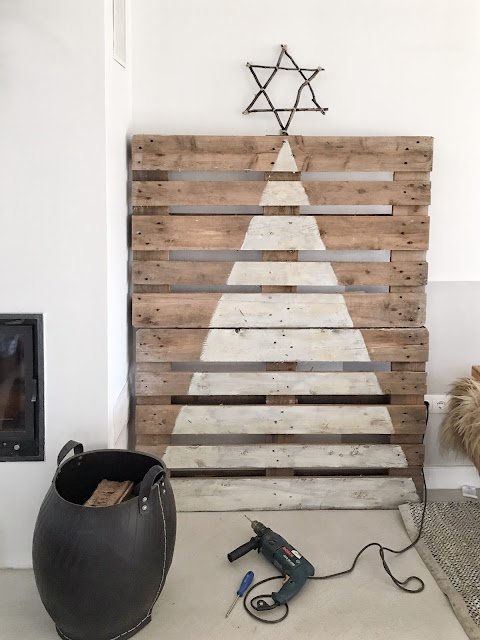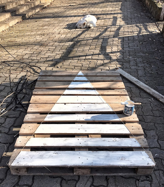Ti, akik régóta olvassátok a blogot, ismertek már annyira, hogy nem szeretem elaprózni a dolgot: ha karácsonyi hangulat, hát szóljon nagyot! :) A látványosság mellett szempont volt még a fenntarthatóság... Nem bírom nézni a boltokat elárasztó sok sz.rt, nem vagyok hajlandó a kínai gyerekek véres verítékével legyártott huszonhetedik porcelán szarvasfejet megvásárolni, hogy aztán a földet elárasztó szeméthegy tetején landoljon pár év múlva, amikor a beton hóember jön divatba... Lehet, hogy a raklap cuccok már a könyökötökön jönnek ki, de az a helyzet, hogy nekem éppen szükségem volt plusz kettő darabra a szénabáláim alá, így jött az ötlet, hogy ezzel kezdjek valamit, hiszen az újonnan beszerzett, két tiszta raklap "rendes" használatbavételig remek dekorációként funkcionálhat. Amúgy az is eszembe jutott, hogy ha valakinek nagyon pici a lakása, vagy elutazik az ünnepekre, akkor egy raklapra felfestett karácsonyfa az eredetit is kiválthatja. Belevágtam hát...
