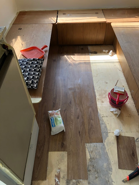 És nekiláttam felragasztani a moduláris, fa hatású vinyl padlót. Először csináltam ilyet, és igazán meglepett, milyen egyszerű. Igaz, mindenem ragadt...