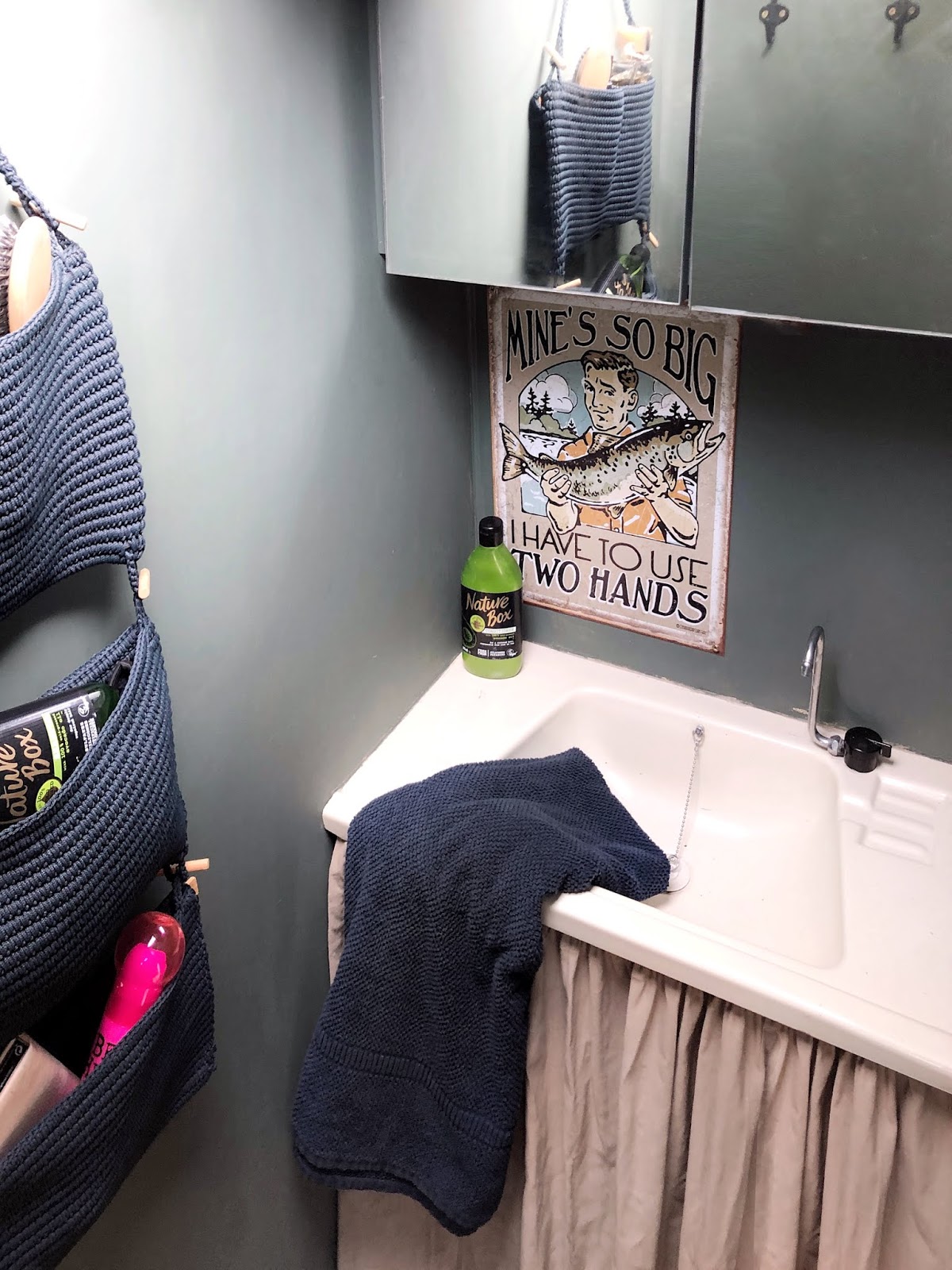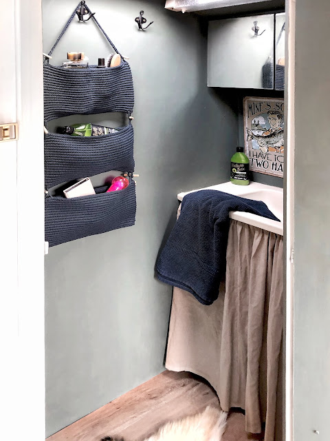 És végezetül, szerintem korábban még soha nem vezettelek be Titeket a fürdőszobába, ami a legutolsó etapban készült el... Úgy éreztem, hogy ez a pici helyiség érdekesebb lesz karakteresebb színnel, így sötétebb zöld árnyalatot kapott (csodálatosan szép - Vintage Paint Dusty Olive), amihez sötétkék kiegészítőket (Ikea) és natúr függönyt álmodtam meg.